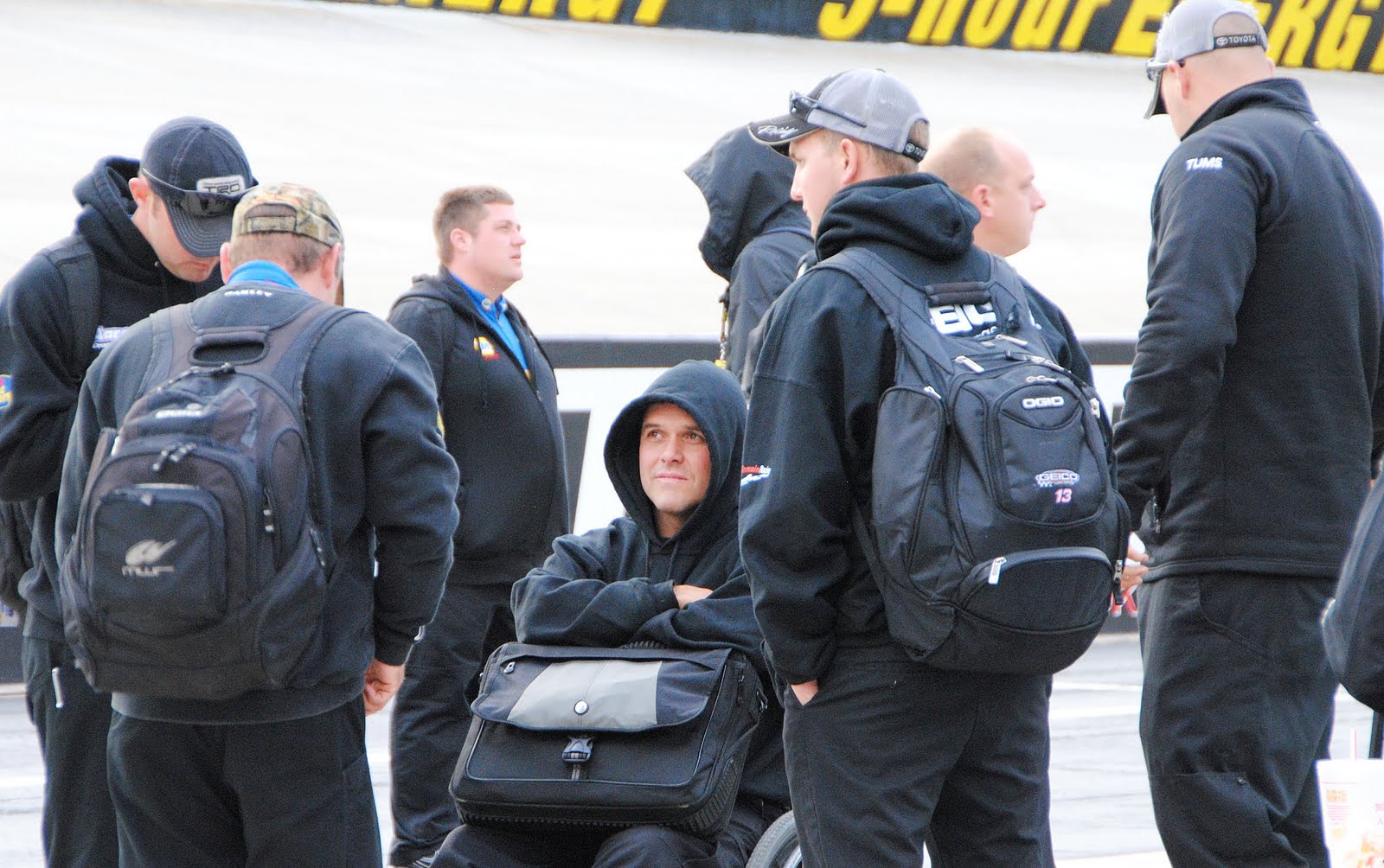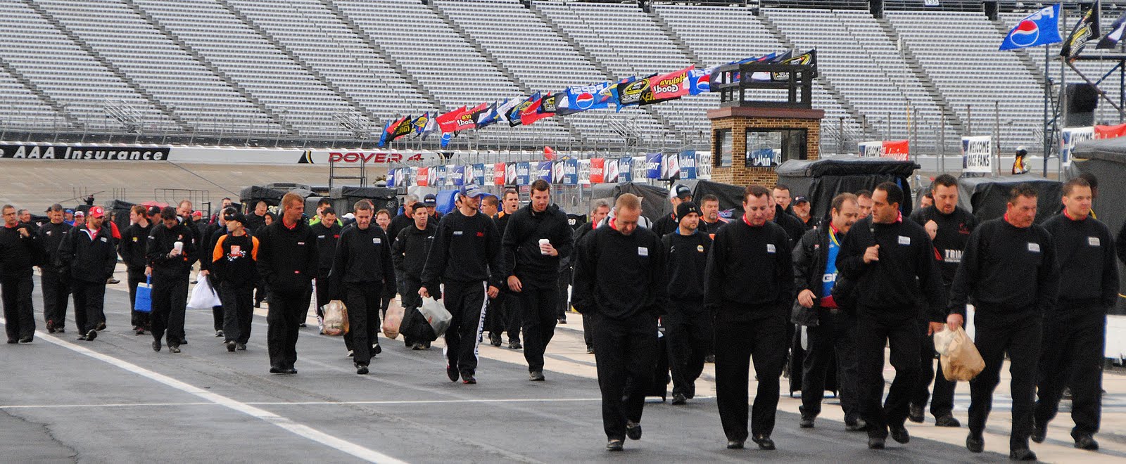 The morning was very misty and chilly. not bone numbing cold, but pretty darn chilly. I took a picture of Booty Barker surrounded by his team, but quite bundled up. Clearly it is time for Nascar to move to a warmer climate and after Kansas we will be in warmer and hopefully dry climates. I know Texas needs rain, but please let it rain before and after November 6th, not during. As I was on the track, I noticed that the top lane has been ground with groves exposing the gravel in the concrete. I have to ask if this give the drivers a warning they are close to the wall or if it helps with grip. I doubt there is any grip advantage, but I am sure the drivers can feel that difference in their tires.